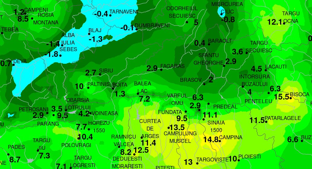 Și miercuri la prânz a fost cel mai cald în locuri neobișnuite, maximele fiind de +15,7 C la Cotnari, +15,5 C la Bisoca și Medgidia, +15,2 C la Rădăuți și +15,1 C la Botoșani. Cel mai rece a fost tot în Transilvania: -1,8 C la Sebeș, -1,4 C la Alba Iulia și -1,3 C la Blaj.