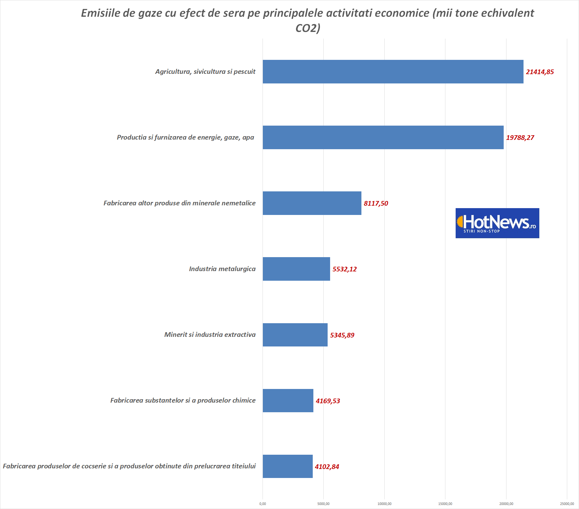 Ponderea cea mai mare a emisiilor de gaze cu efect de seră aparţine activităţilor de producţie şi furnizare de energie electrică şi termică, gaze, apă caldă şi aer condiţionat (CAEN D), urmată de activităţile din agricultură, silvicultură şi pescuit (CAEN A)