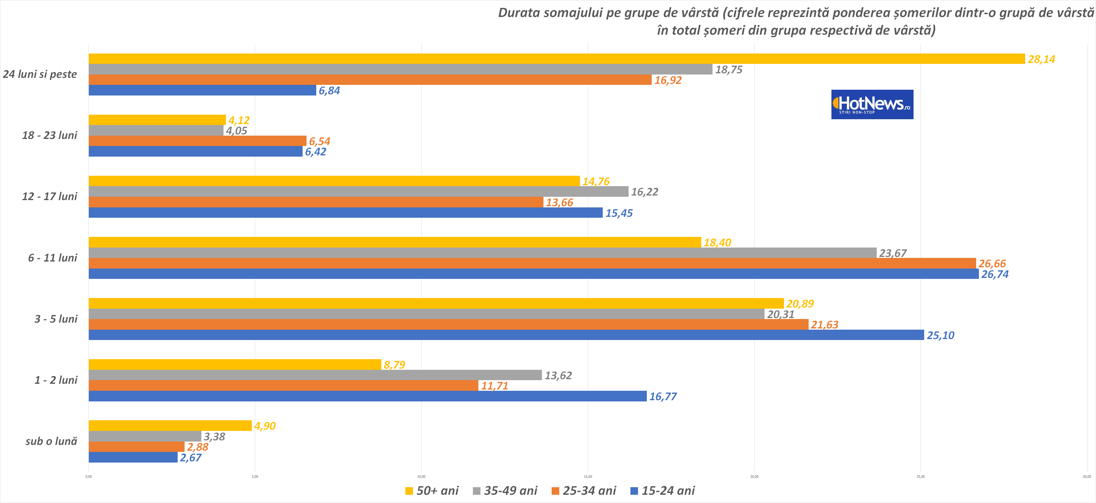 Cu excepția celor de peste 50 de ani, la toate grupele de vârstă cei mai mulți stau circa 6-11 luni până să obțină un job nou. În cazul celor de 50+, durata șomajului în cazul celor mai mulți dintre cei de peste 50 de ani este de peste doi ani. Sunt și din cei care își găsesc după o lună de așteptare, dar cazurile sunt puține (4%). „Grosul” (aproape o treime) așteaptă doi ani până să-și găsească un nou angajator.