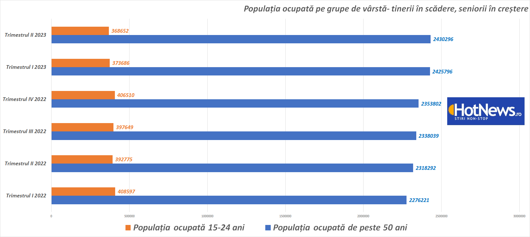 Dacă ne uităm la numărul populației ocupate pe grupe de vârstă, vedem că numărul tinerilor care lucrează este în scădere, iar cel al românilor de peste 50 de ani crește ușor. Mai mult, rata șomajului la peste 50 de ani este la jumătate din media națională.