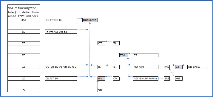 Sursa datelor: Institutul Național de Statistică (INS), Recensământul 2021. În grafic sunt figurate numai fluxurile de maximă intensitate. Volumul fluxului este exprimat în mii persoane, cifră rotunjită pentru a corespunde scalei din stânga figurii. Exemplu: Fluxul de la Iași la București pentru ultima migrație, populația rezidentă a fost, la recensământul din 2021, de 15 mii de persoane care au locuit, anterior datei de recensământ, la Iași și s-au mutat cu rezidența la București.