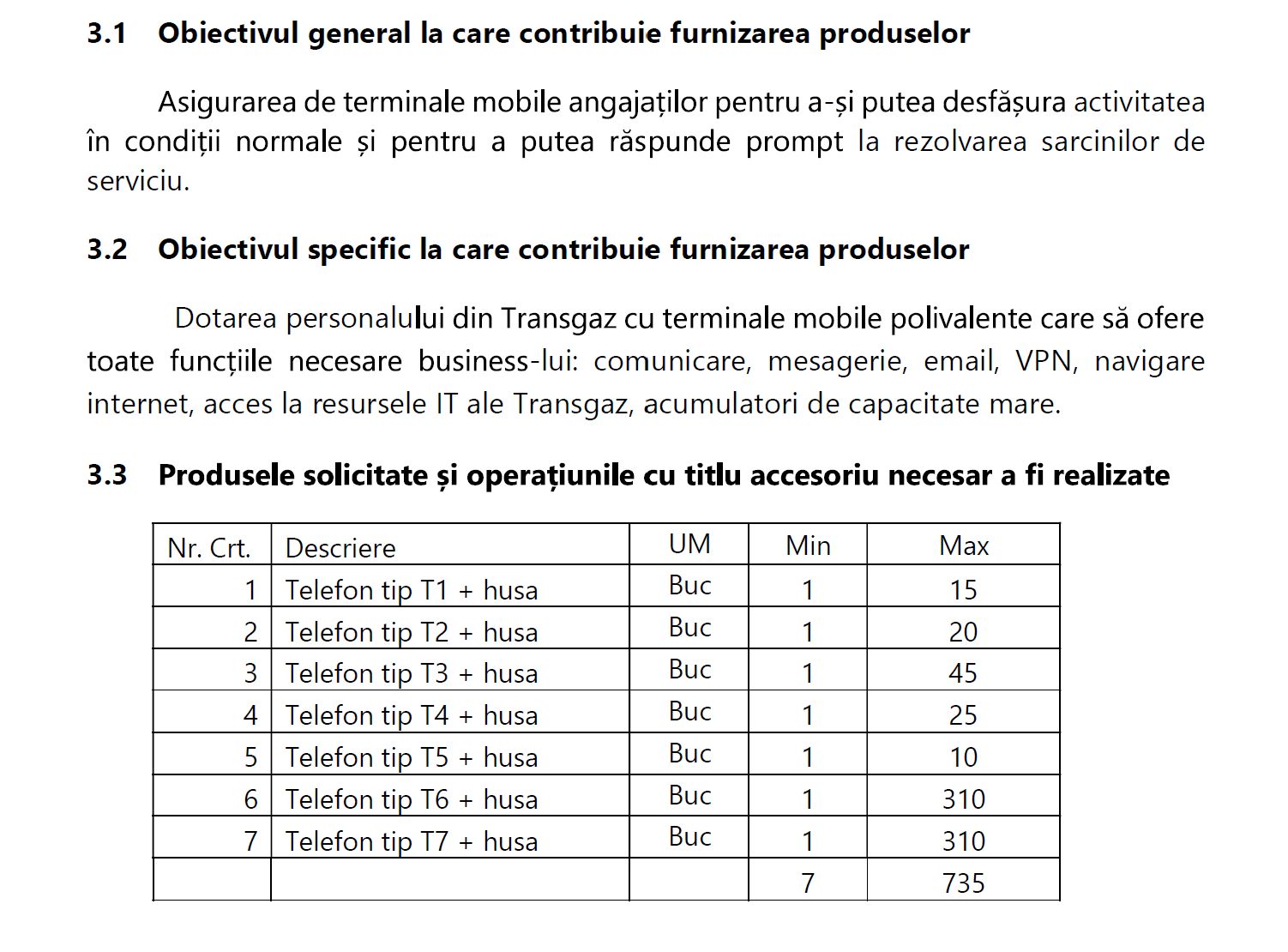 Transgaz a solicitat 7 tipuri de telefoane iOS și Android lansate pe piață în anul 2023, iar datele tehnice, din caietul de sarcini, arată că primele trei tipuri de telefoane sunt iPhone-uri de ultimă generație. (maxim 80 de terminale în cele 18 luni).