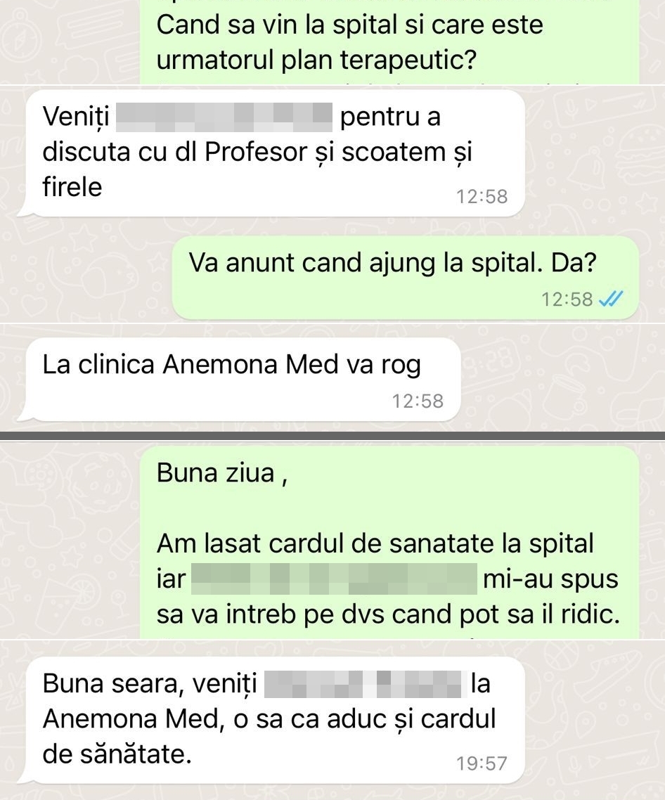 După două zile, pacientul a fost contactat de un rezident și i-a transmis ziua și ora când poate să vină la consult la „domnul profesor”. „La spital?”, l-a întrebat pacientul în scris. ”Nu, la clinica Anemona”, i-a răspuns rezidentul.