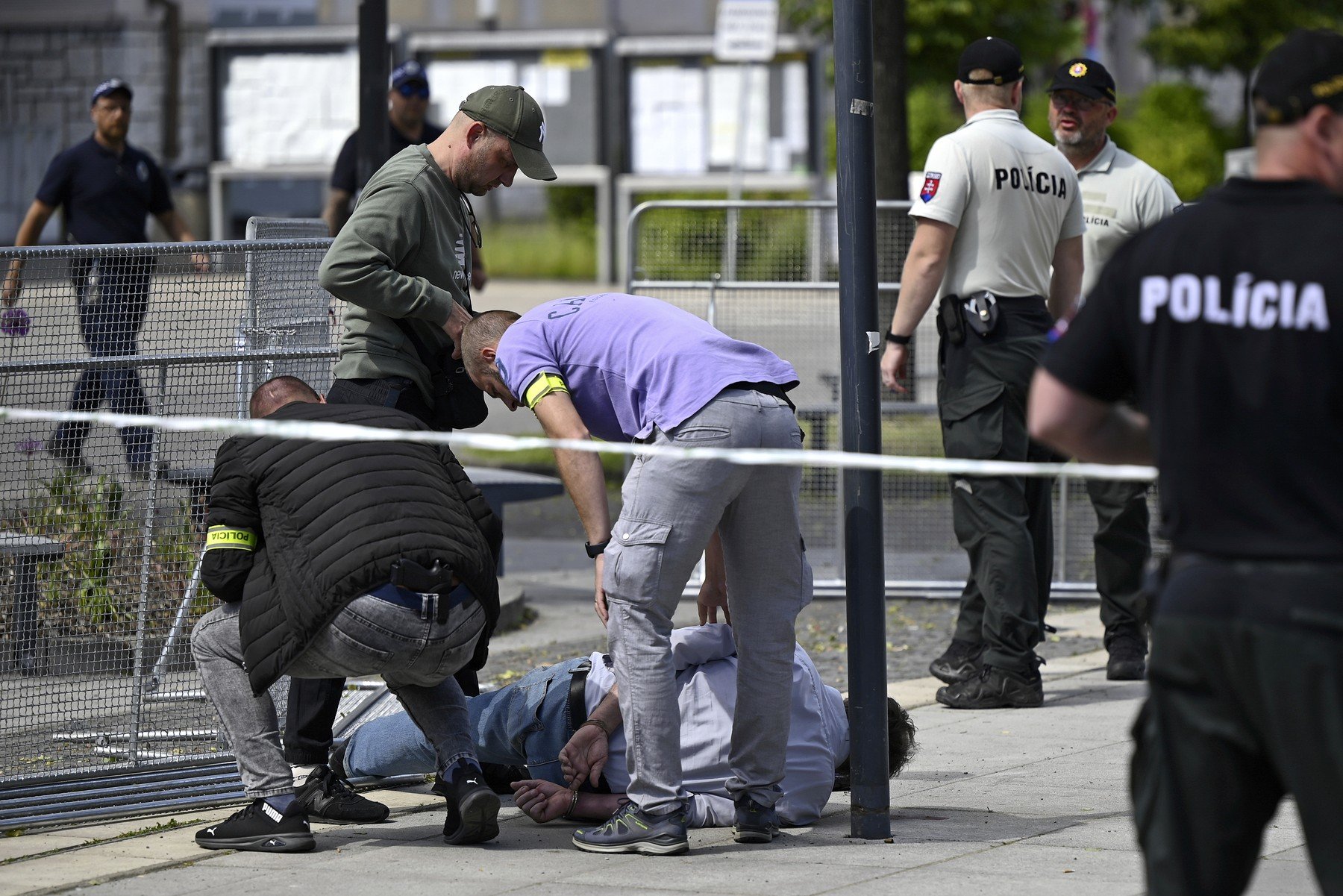 Explicație foto: Poliția arestează un bărbat după ce prim-ministrul slovac, Robert Fico, a fost împușcat. Sursa foto: Radovan Stoklasa / AP / Profimedia