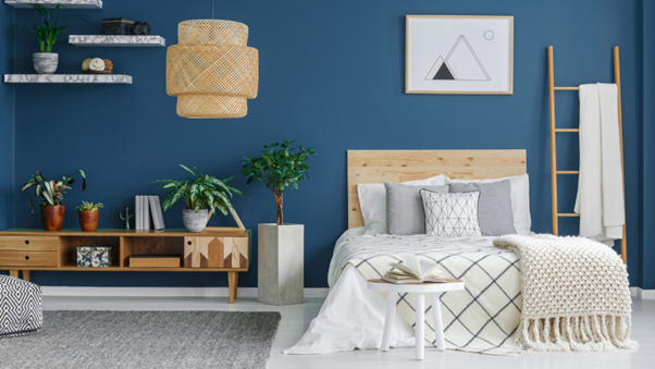 - Dormitor: Draperiile sau covoarele în albastru cerneală aduc un aer de calm și relaxare, ideale pentru un spațiu destinat odihnei.