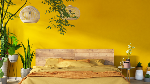 - Dormitor: Un perete accent în galben muștar poate aduce un strop de soare și bucurie, completat de mobilier alb sau din lemn deschis.