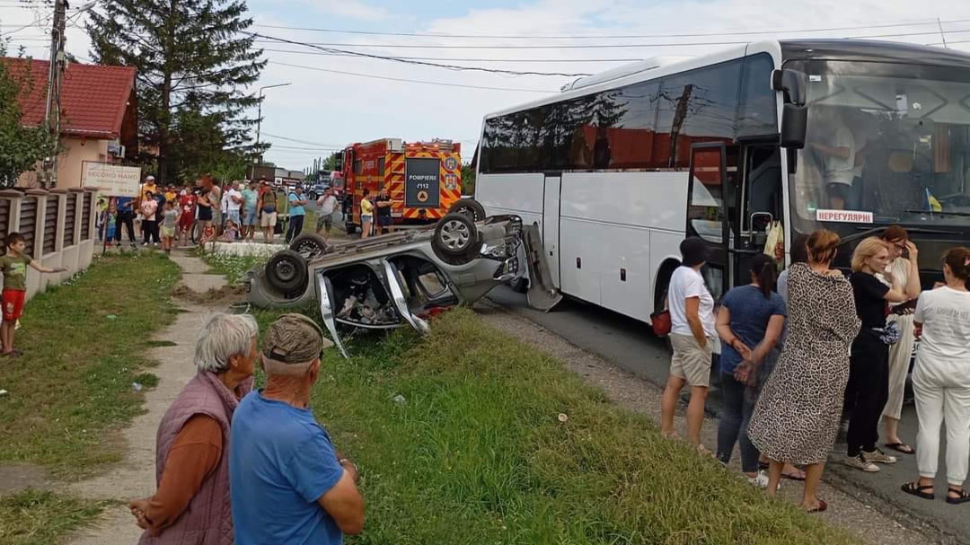 Autocar cu 48 de pasageri la bord, lovit în plin de un autoturism. Cei din mașina mică sunt răniți