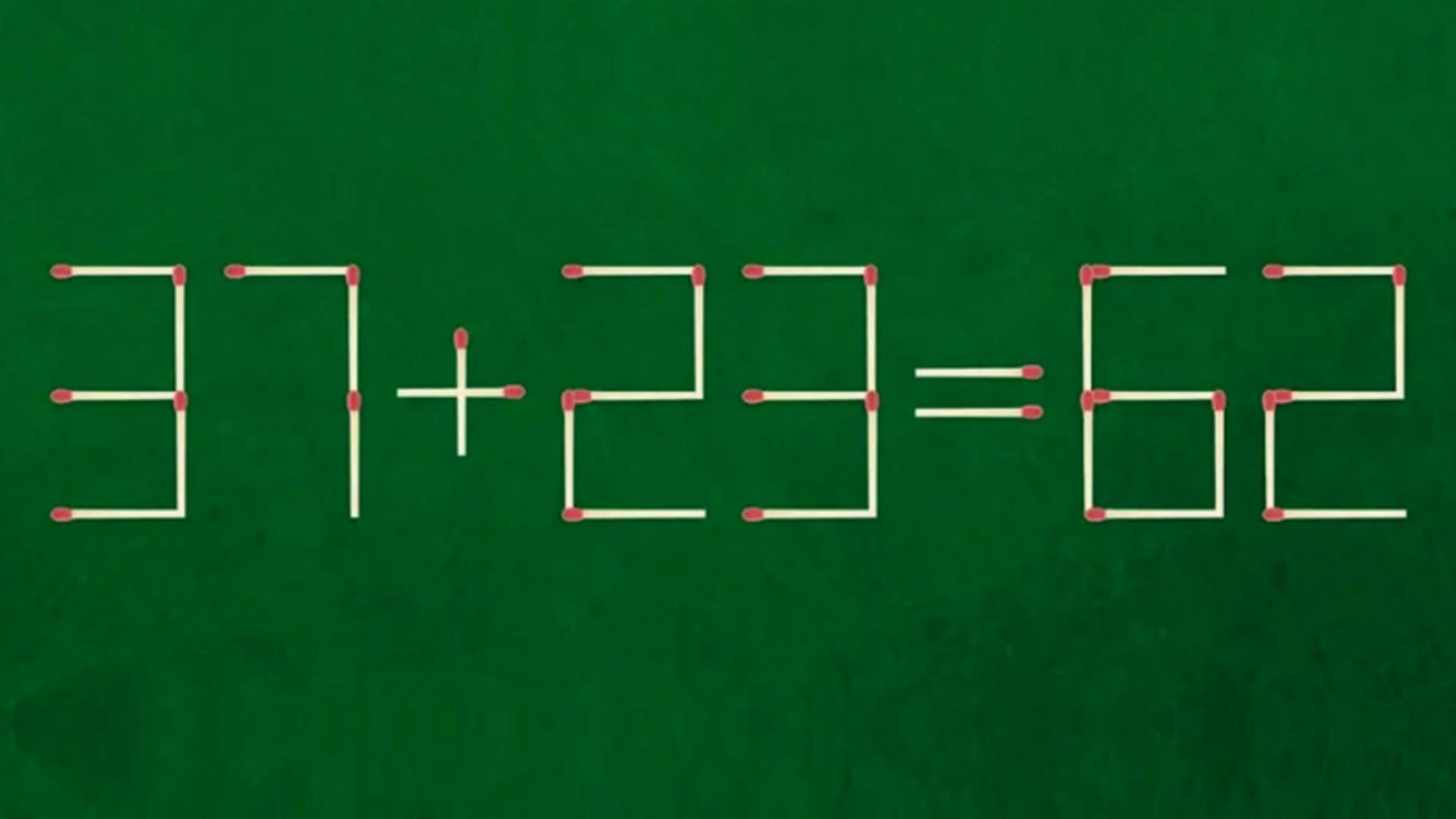 La o primă privire, este evident că 37 + 23 nu fac 62. Aici intervine provocarea: să identifici modul în care trei bețe de chibrit pot schimba ecuația pentru a deveni corectă. Răspunsul constă în adăugarea celor trei bețe de chibrit pentru a transforma cifra 7 din 37 în 9, obținând astfel ecuația 39 + 23 = 62, care este corectă.